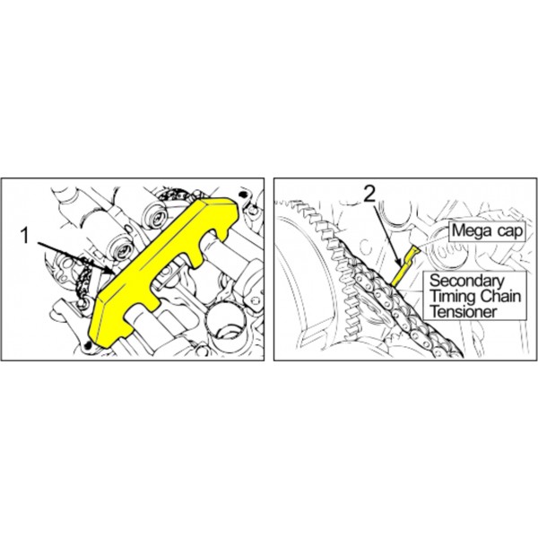 Опис Інструмент призначений для фіксації розпредвалів у ВМТ та фіксації натягувача ланцюга. Застосування: EDGE, EXPLORE F-150, MKX, FLEX, FUSION, MILAN, MKT, MKZ, MUSTANG, SABLE, TAURUS та аналоги. Двигуни: 3.5L, 3.7L, 4.0L з 2007 р.в.