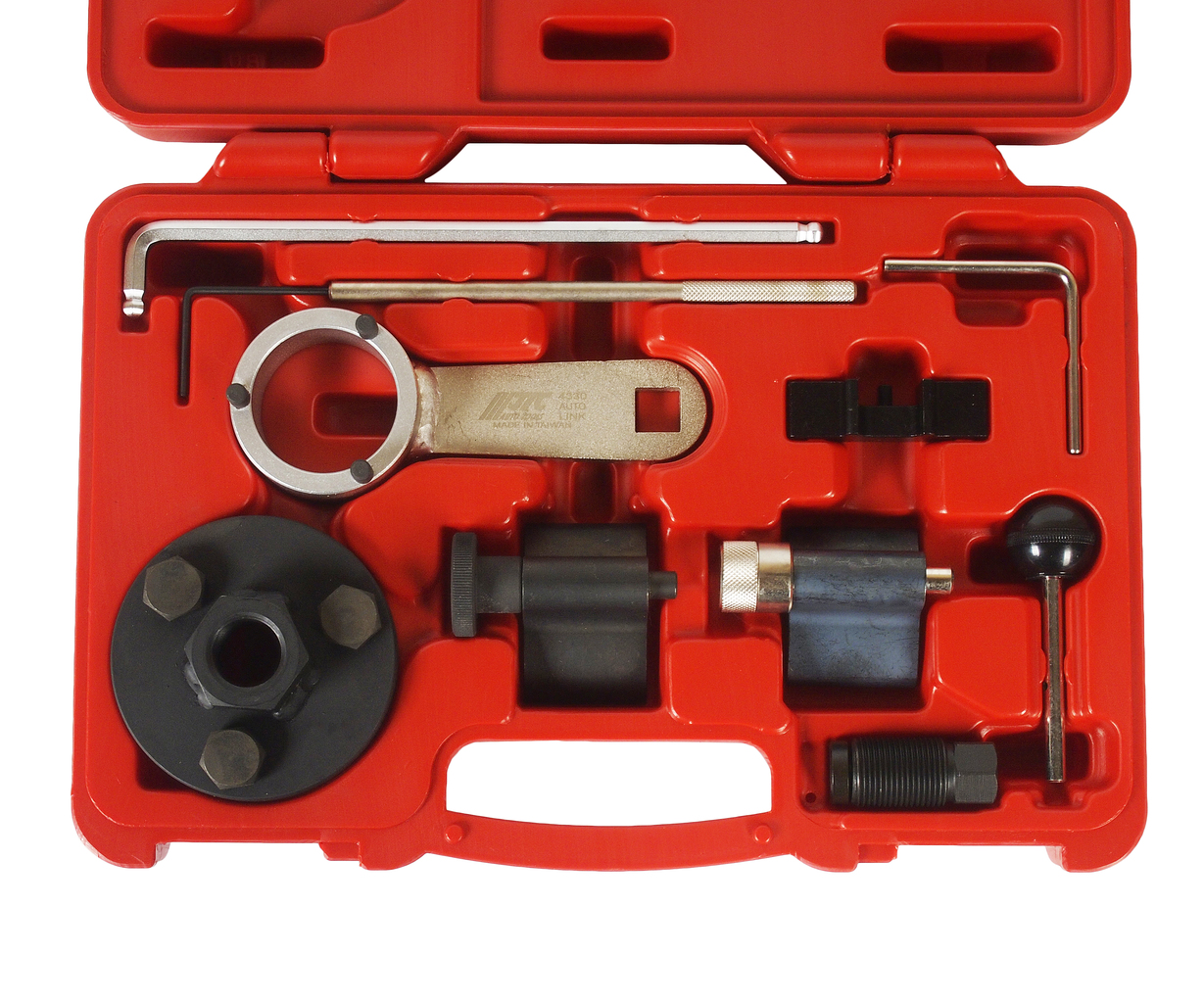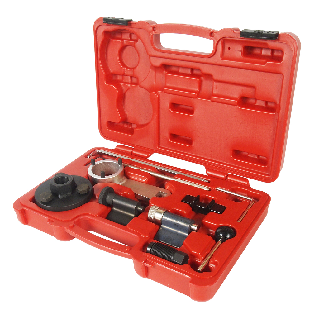 Опис Застосування інструменту VAG: двигуна 1.6 | 2.0 TDi CR, а також Audi A3 A4 | A5 | A6/Q5 | Volkswagen Golf | Тігуан | Passat | Eos та Seat Exeo. Дизельні двигуни 5-го покоління (Blue Motion). Комплектація набору для встановлення ГРМ VAG TDi: T10050 фіксатор коленвала (FORD 310-085); VAG 3359стопор зубчастого колеса ТНВД; T10100 фіксатор коленвала; T10264 шестигранник для приводного ролика; T10265 - фіксатор натяжного ролика; T10052 - знімач зубчастого колеса розподільного валу; T10255інструмент для фіксації балансирного валу; T40098стопор плунжера приводного ролика; T10051інструмент для фіксації розподільного валу; Кейс для зберігання інструментів.