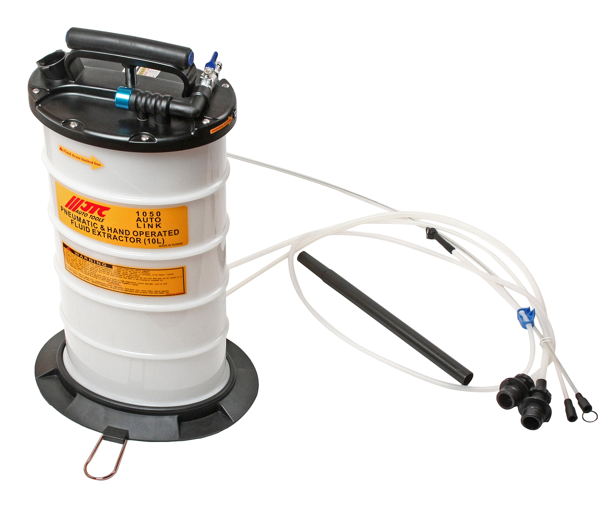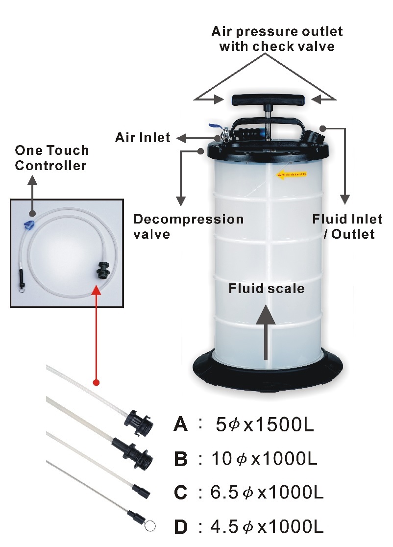 Комплектація Пристрої для відкачування технічних рідин із ручним приводом - 1 шт. Шланги: A: Ø5x1500 мм.B: Ø10x1000 мм.C: Ø6.5x1000 мм.D: Ø4.5x1000 мм. – по 1 шт. кожного. Трубки для зберігання шлангів. Дріт для очищення шлангів – 1 шт. Пристрій призначений для відкачування технічних рідин за допомогою розрядження та спустошення ємності підвищеним тиском. Розрядження створюється при впливі на ручний привід пристрою та/або при підключенні до пристрою стисненого повітря. Пристроєм для перекачування технічних рідин можна перекачувати важкозаймисті водонерозчинні рідини при дотриманні максимально допустимої температури 1-95 Пристрій оснащений декомпресійним клапаном нової конструкції для створення вакууму. 3 отвори для випуску повітря з контрольним вентилем призначені для швидкого випуску повітря із пристрою. Стійка основа для зручності роботи. Не дає іскри під час роботи. Можливість перекачування рідин: вода, моторні та трансмісійні олії, гальмівна рідина. Технічні характеристики Ємність: 10 л. Рекомендований робочий тиск (пневмопривід): 2.8-12 бар.