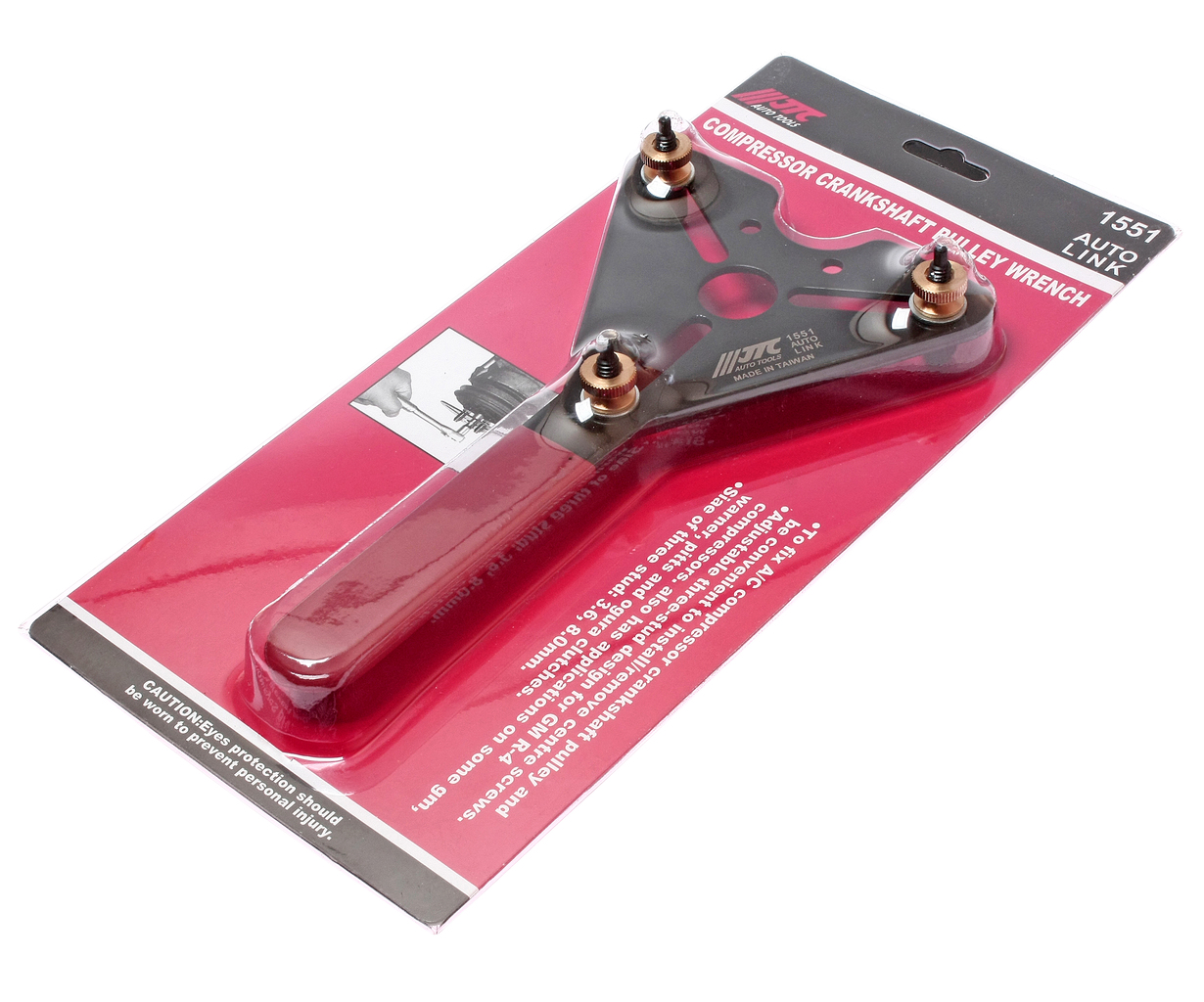 1551 JTC Застосовується для фіксації шківа компресора кондиціонера під час встановлення/зняття центральних болтів. Конструкція з трьома пальцями, що регулюються, підходить для компресорів автомобілів GM R-4. Також використовується для зняття/установки фрикційних дисків марки GM, Warner, Pitts та Ogura. Розміри пальців: 3, 6, 8.0 мм.