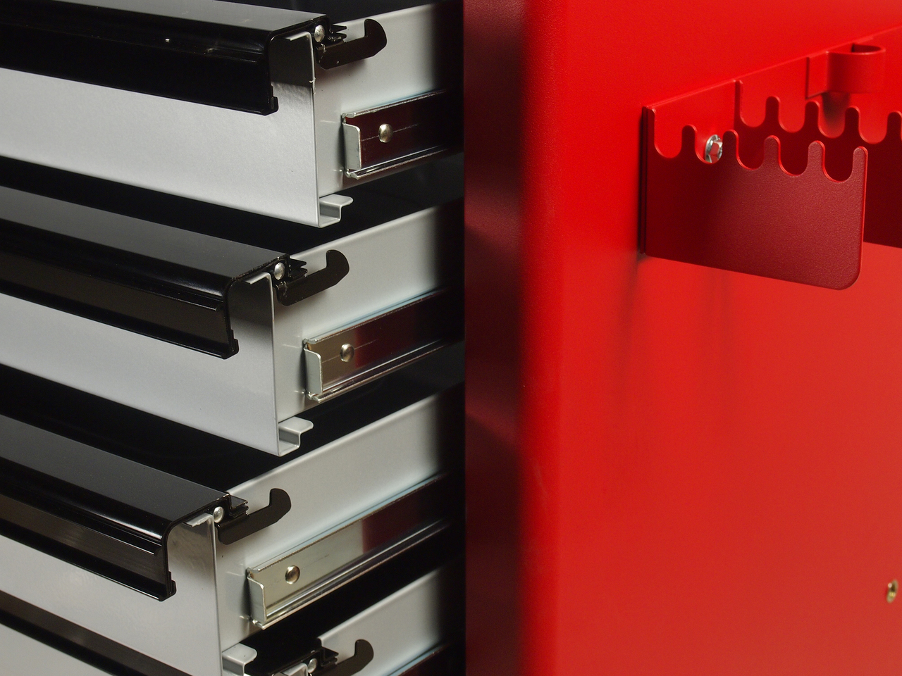 Опис У комплекті: Візок для інструменту JTC-3931: 7 секцій: п'ять плоских (580х377х59 мм.) та два глибоких (580x377x138 мм.) висувних ящиків забезпечують можливість розміщення великої кількості робочого інструменту. Всі ящики забезпечені швидкознімними полозами на роликах, повністю висуваються і легко виймаються з візка. Кожна скринька обладнана двома індивідуальними фіксаторами, які запобігають довільному відкриттю скриньки під час пересування візка. Велика ручка сприяє зручному переміщенню під час роботи. 4 поворотні колеса розміром 5 забезпечені гальмами і витримують навантаження 200 футів, що забезпечує високу маневреність візка. Спеціальні пристрої на бічній стінці дозволяють розміщувати ключі з Т-подібною рукояткою. Наявність центрального замку забезпечує додатковий захист від несанкціонованого доступу до інструменту. Розміри скриньки: 580х377х74 мм. (153 мм. два нижніх) Розміри зібраного візка: 687х459х1000 мм. 5 секцій з інструментами (344 шт.): 1 секція – K2732, K3084, K3232, K1401. 2 секція – K4082, K4221, K4172, K4241. 3 секція – K4151, K4223, K4181, K8051. 4 секція – K6082, K6084, K6172, K6102. 5 секція – K7102, K7091, K5031, K5043. Загальна кількість інструментів: 344 шт.