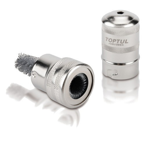 Пристрій для чищення клем АКБ TOPTUL JDBV3984. Застосовується для очищення клем акумуляторних батарей та висновків акумуляторів. Два види очищення: внутрішня та зовнішня щітка. Не треба користуватися наждачним папером! Постійне утворення оксидів на контактних поверхнях клем проводів та висновків акумулятора вказує на підвищену напругу в бортовій мережі автомобіля через неправильну роботу регулятора напруги генератора.