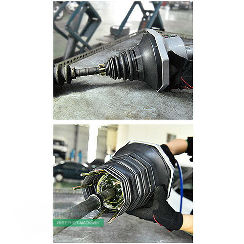 Пристрій для заміни пильника ШРУСа пневматичне TOPTUL JEBE0111. Знімач спеціально розроблений для розтягування пильовика на вузлах ШРУСу автомобілів. Встановлює гнучку кермову тягу та пильовик ШРУСа, не знімаючи вісь з автомобіля або шарнір CV з осі. Економія робочого часу до 70% та запобігання пошкодженню ШРУСу. Композитний корпус із простим регулюючим клапаном працює від стаціонарного джерела стисненого повітря. Для виконання робіт не вимагає додаткового мастила. Підходить більшість автомобілів, невеликих фургонів, легкого комерційного транспорту. Матеріал: алюмінієвий сплав. Знімач комплектується двома штуцерами: європейський та японський тип.