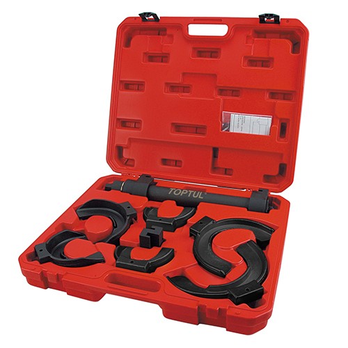 Стяжка пружин універсальна, спеціально розроблена для підвіски Макферсона, використовуючи три комплекти змінних монолітних комплектів для стяжки. Стяжка пружин на всіх типах підвіски МакФерсона. Підходить для BMW, Toyota, Ford, Mitsubishi, VW, Audi, Saab, Nissan, Honda, Accord, Subaru, Volvo, Opel і Porsche. Матеріал: хром-молібденова сталь. Діапазон стиснення/розтискання пружин: 80-115 мм, 110-150 мм, 140-195 мм. Максимальне завантаження – 3,500 кг.