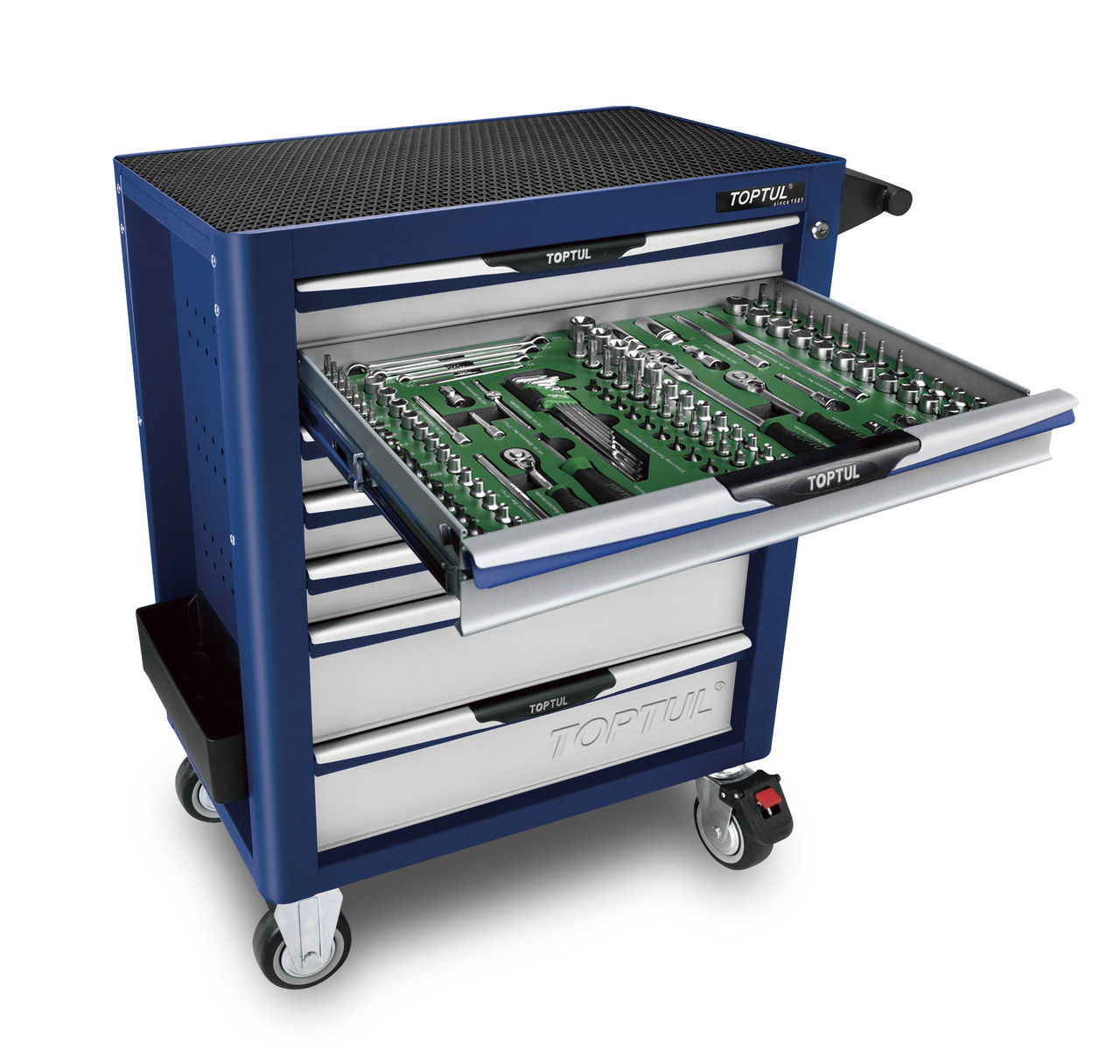 Візок з інструментом 7 секцій 282ед. VW-Audi Group. Обладнана великою, міцною пластиковою ручкою; Корпус оснащен защитными бортами, что сводит к минимуму риск повреждения оборудования и нанесения травм автомеханика во время перемещения по СТО; Одновременно может быть открыт только один ящик. Конструкция ящика одновременно учитывает все требования по безопасности эксплуатации; Колеса размером 5"х2" изготовлены из термопластинчатого каучука, обеспечивают легкое перемещение тележки; Выдвижные ящики оснащены нескользящими вкладками. В комплекте предусмотрен верхний коврик из АБС, предназначенный для удобного хранения различных мелких деталей. Перфоровані бічні стінки з квадратними отворами надають можливість розмістити додаткові аксесуари для зберігання інструментів. Застосовується з гачками серії TEAA; Порошкове покриття поверхні захищене від подряпин і стійко до воздействиюрастворителей; В комплект входить полка для розміщення тари.