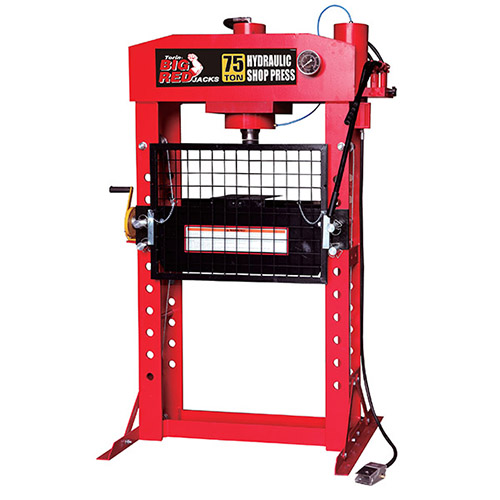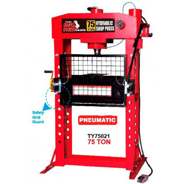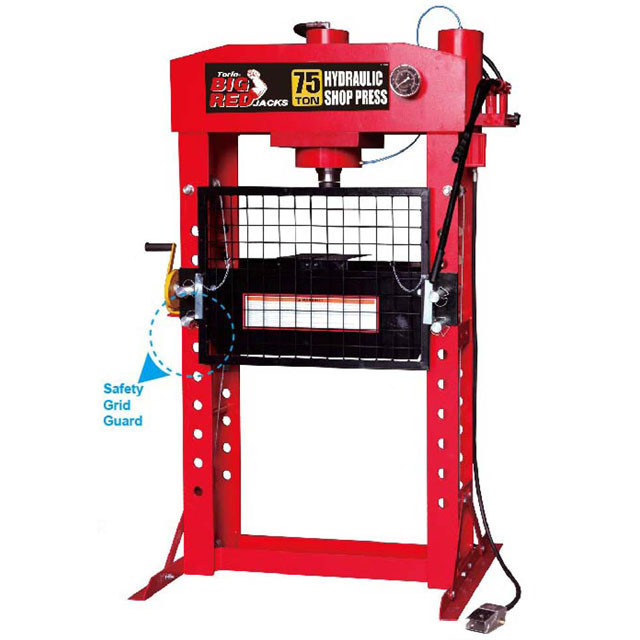 Вертикальний гідравлічний прес Torin TY75021 призначений для опресовування деталей, для загинання різних конструкцій, для запресування та випресування підшипників та втулок, а також стане ідеальним посібником при склеюванні поверхонь під високим тиском. Максимальне зусилля, яке створюється даним вертикальним гідравлічним пресом становить 75 тонн. Конструктивно вертикальний гідравлічний прес складається з потужної рами, гідроциліндра, гідронасоса з пневмоприводом, манометра (щоб контролювати тиск, що створюється) і лебідки для полегшення коригування робочої площини по висоті. Також вертикальний гідравлічний прес обладнаний захисною рамою для гарантування повної безпеки оператора-механіка. У манометр гідравлічного преса залитий спеціальний морозостійкий гель (до -5°C) для плавності ходу стрілки. Пневмопривід подається при натисканні ножної педалі, що сприяє полегшенню праці оператора.