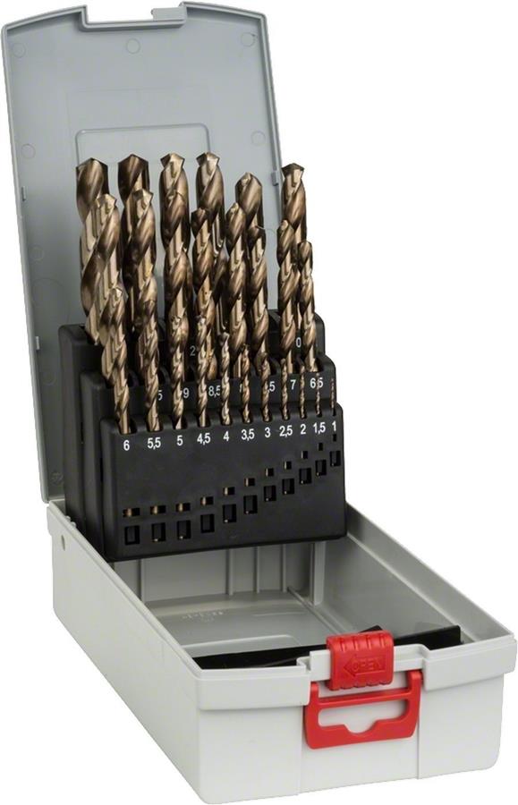Набір свердлів Bosch HSS-Co за стандартом Din 338 для свердління наскрізних та глухих отворів у сірому чавуні, сталевого лиття, кислото- та жаростійких сталей, легованої та нелегованої сталі твердістю до 1000 Н/мм2.