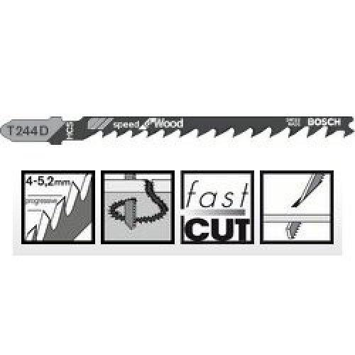 Пильне полотно Bosch Speed for Wood T 244 D із високовуглецевої сталі зі шліфованими зубами для швидкого товстого різання по кривій м'якої деревини, ДСП, ДВП, столярних плит (5-50 мм).