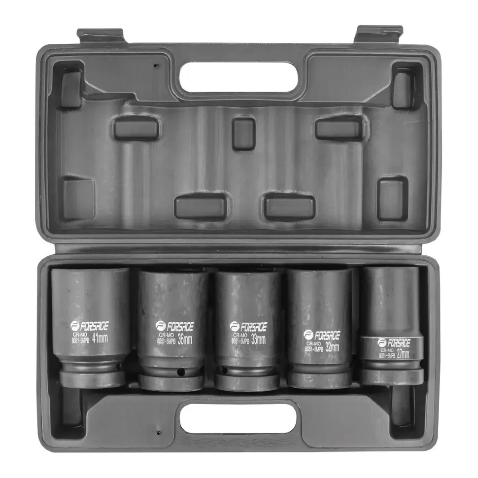 Представляємо набір шестигранних ударних глибоких головок Forsage F-8051-5MPB - це професійний комплект із 5 предметів з посадковим квадратом 1". Висока міцність і довговічність: Головки виготовлені з високоякісної хромомолібденової сталі (Cr-Mo). вантажними автомобілями, сільськогосподарською технікою та у будівельній сфері. Вони дозволяють ефективно затягувати та відкручувати великогабаритні кріплення, розташовані у важкодоступних місцях. Універсальні розміри: До комплекту входять головки найзатребуваніших розмірів для важкої техніки: 27, 32, 33, 36, 41 мм. Це охоплює більшість стандартних завдань, з якими стикаються на СТО та в промисловості. Зручність зберігання та транспортування: Набір постачається у міцному кейсі, який забезпечує надійний захист інструментів від пошкоджень, зручне зберігання та легке транспортування на робоче місце. Комплектація: Ударні 6-гранні глибокі головки 1": 27, 32, 33, 36, 41 мм Міцний кейс