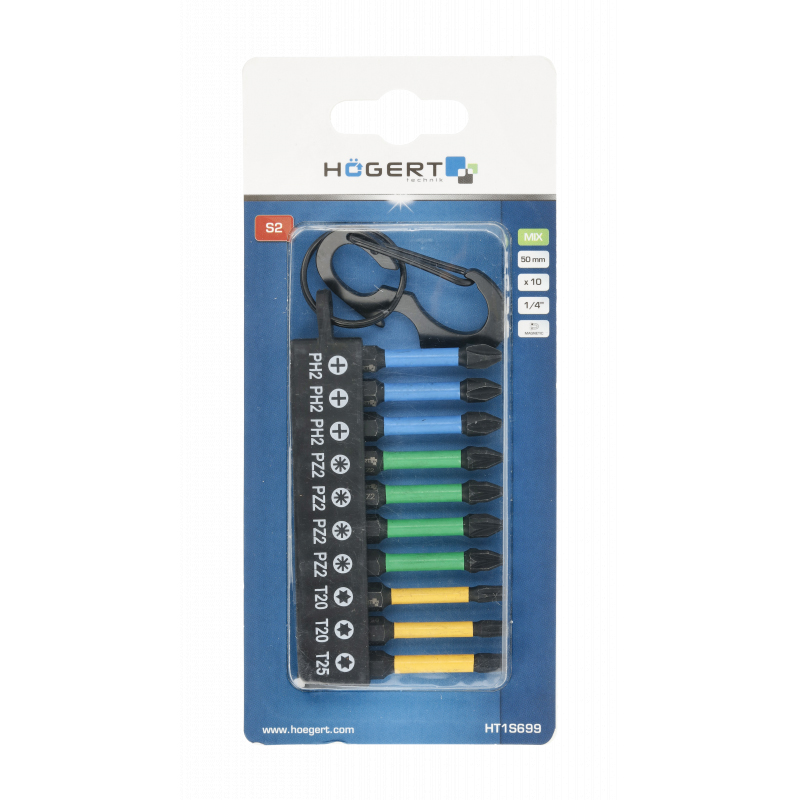 Набір з 10 біт, призначених для використання з ударними шуруповертами та дрелями з патроном 1/4". Для виконання важких робіт вони виготовлені з високоякісної загартованої легованої сталі S2. Склад металу, з якого виготовлені біти, робить їх більш стійкими до скручування при передачі зусилля на гвинт, а значить, вони можуть працювати з великими моментами, що крутять.Технологія термічної та механічної обробки робочої частини робить інструменти досить гнучкими для поглинання ударів. Намагнічений наконечник полегшує роботу із шурупами. Практична упаковка з додатковим гачком (карабіном) дозволяє легко зберігати та носити біти із собою.