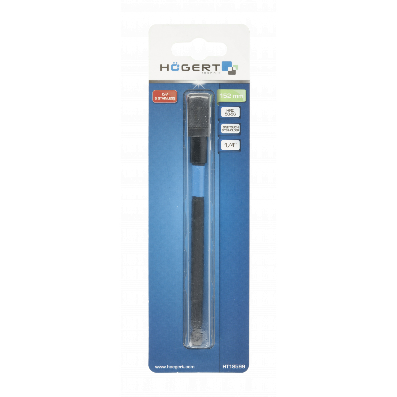 Тримач біт, призначений для використання з дрелями з патроном 1/4"" та ударними шурупокрутами. Гніздо для біт 1/4 HEX. Для виконання важких робіт корпус виготовлено з високоякісної хром-ванадієвої сталі, а гніздо для біт - з нержавіючої сталі. Склад металу, з якого виготовлений інструмент, робить його більш стійким до скручування під час передачі зусилля на гвинт, а отже, він може витримувати більші обертальні моменти. Технологія термічної та механічної обробки робить рукоятку досить гнучкою та ударопоглинаючою. Сильний магніт надійно утримує біти в тримачі. Проста і надійна фіксація біти за допомогою системи "One Touch Bits Holder".