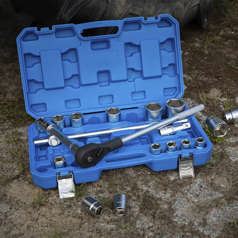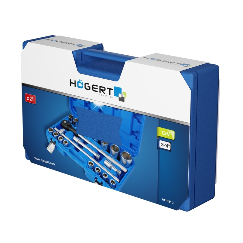 Набір з 21 предмета, що складається з тріскачки, торцевих голівок та інших аксесуарів 3/4”. Незамінний для будь-якої майстерні або автосервісу.