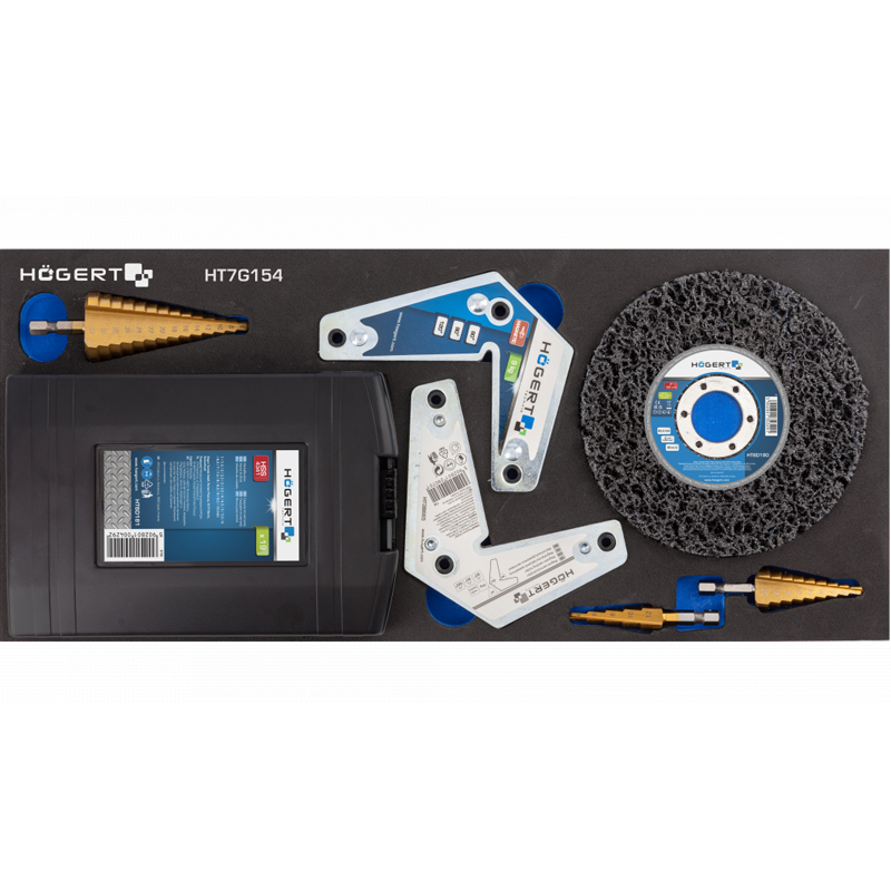 - комплект із двох Г-подібних магнітних зварювальних тримачів для підтримки металевих листів, труб і стрижнів, що піддаються зварювальній обробці, масою до 9 кг;