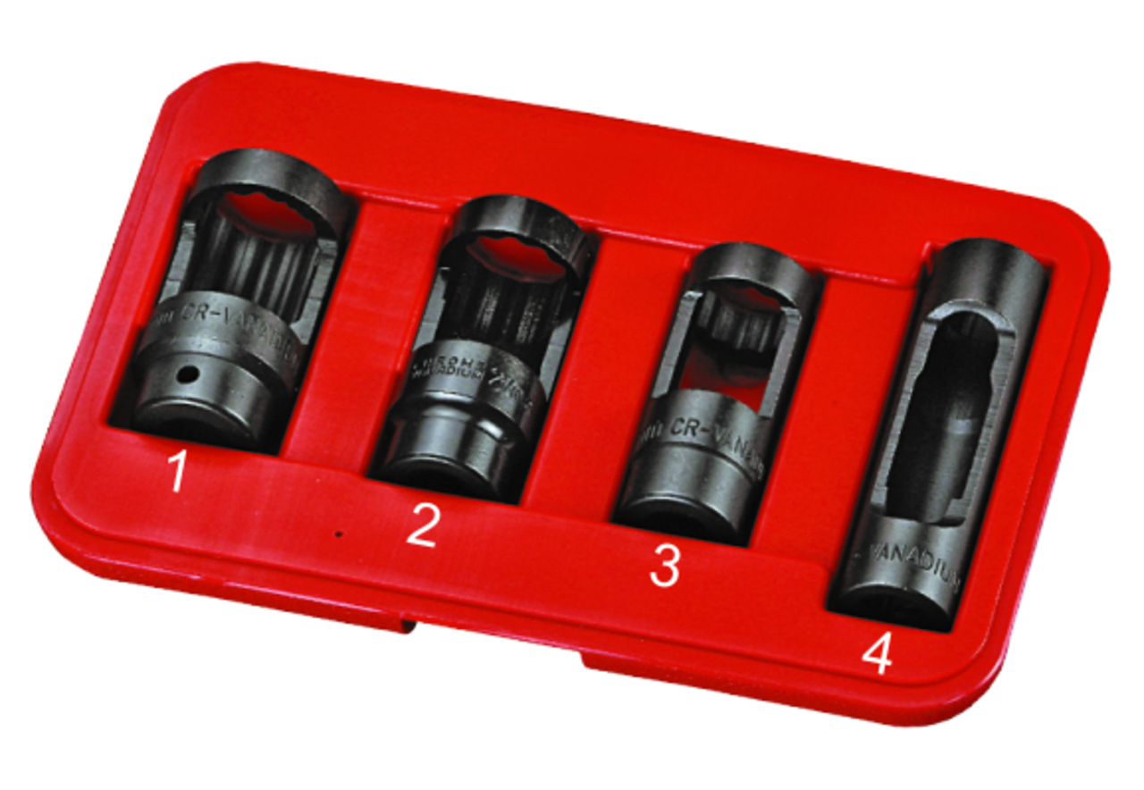 Головки (набір) для зняття кисню. У комплекті (квадрат приєднання 1/2;): 28 мм. (12-гранна довжина 78 мм.) 27 мм. (12-гранна довжина 82 мм.) 22 мм. (12-гранна довжина 80 мм.) 22 мм. (6-гранна довжина 108 мм.) Загальна кількість предметів: 4 шт. Упаковка: міцний переносний кейс.