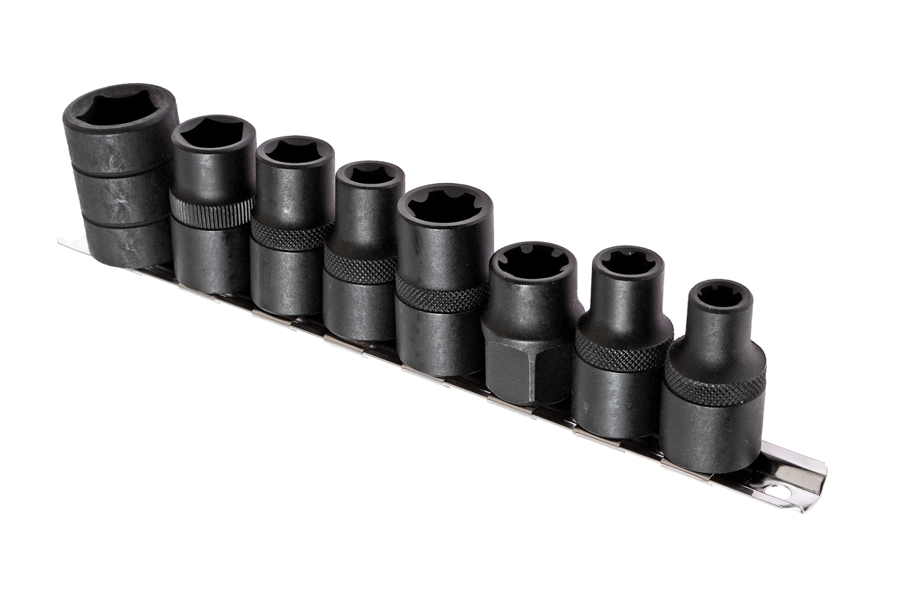 Набір спеціальних п'ятигранних та RIBE головок для відкручування деяких видів спеціальних болтів автомобілів. Застосовується, наприклад, для болтів головки двигуна, центральних болтів проміжного валу тощо. У комплекті: Головки RIBE: 1/2DR x M6S, M8S, M10S, M12S. П'ятигранні головки: 1/2DR х 10, 12, 14, 19 мм. Матеріал: хромованадієва стальЗагальна кількість голівок: 8.