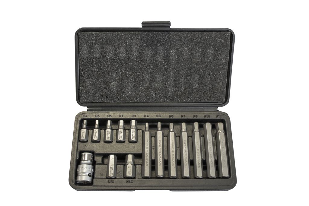 Набір ROCKFORCE RF-4155 включає 15 предметів: 14 біт HEX із шестигранним хвостовиком 10мм, із сталі CrV, та перехідник. Перехідник дозволяє встановлювати біти на ключ-тріскачку, пневмогайковерт або пневмотріщину для монтажу та демонтажу єврогвинтів зі шліцами HEX H4-H12. Набір призначень для використання в автомайстернях та на виробництві автомобілів. Високий ресурс - біти з хромованадієвої сталі твердістю 50-53 HRC відрізняються зносостійкістю.Можливість роботи у важкодоступних місцях – в комплект входять насадки завдовжки 75 мм. Зміст: 10 мм шестигранник 4; 5; 6; 7; 8; 10; 12 мм (30 мм)10 мм шестигранник 4; 5; 6; 7; 8; 10; 12 мм (75 мм)Тримач біт 1/2"DR.x10мм