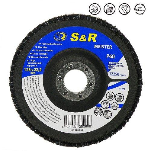 S&R Meister 125x22.2, Z60 – пелюсткове коло для зачистки та шліфування металевих та дерев'яних поверхонь. Використовується з шліфувальними машинами для зняття фарби з поверхні, зварювальних швів, нерівностей, шорсткостей та ін. Має вигнуту форму Т29 з діаметром посадкового отвору 22,2 мм.