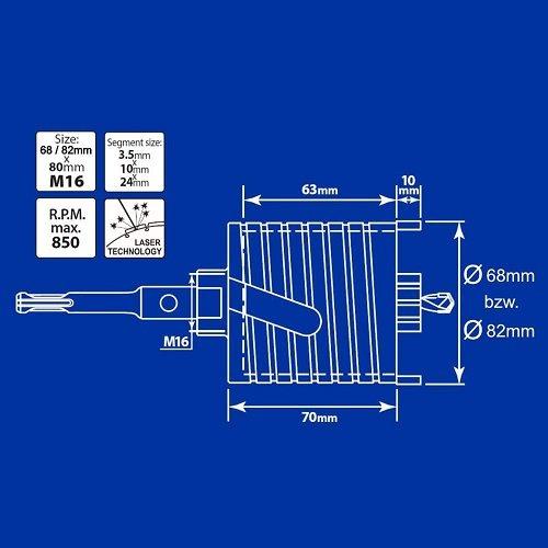Коронка алмазна S&R D68 мм по бетону — професійний інструмент для свердління отворів діаметром 68 мм у бетоні, цегли, камені. Сумісна з дрилями з патроном SDS-plus. Максимально допустима швидкість роботи з коронкою – 1030 об/хв. Не допускається свердління інструментом в ударному режимі. Особливості алмазної коронки S& з найбільш твердими поверхнями.