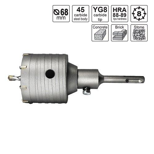 S&R 68x70мм – збірна система буріння для свердління отворів у бетоні, камені, цегли та інших міцних будівельних матеріалах. Використовується для роботи з перфоратором з патроном SDS-plus. 8 твердосплавними напайками з карбіду з високою міцністю HRA 88-89. Карбідні напайки дозволяють швидко бурити надміцні матеріали, а також збільшують термін служби коронки. Глибина пустотілої коронки – 70 мм.