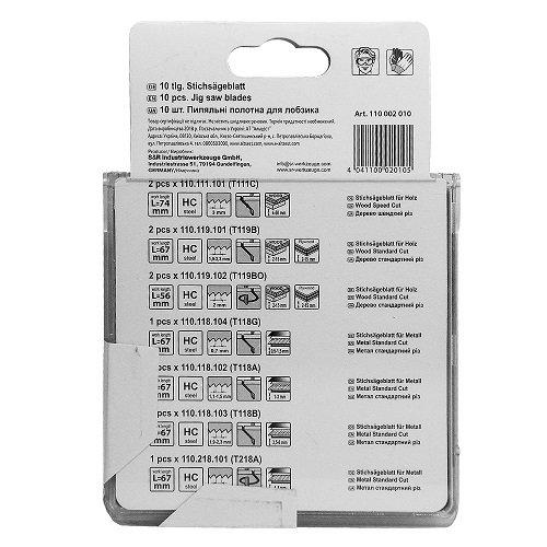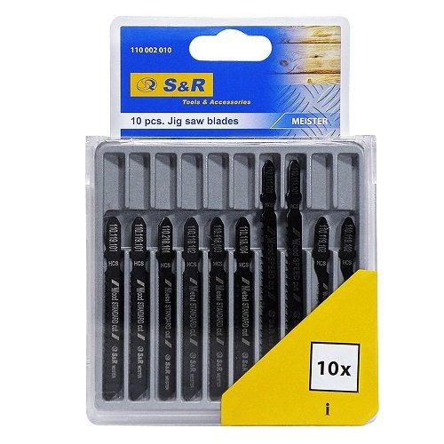 S&R Meister 10 шт. дерево/метал – набір пильних полотен для розпилу дерев'яного та матеріалів, що містять деревину: ДСП, МДФ, ДВП, для розрізу листового металу. У набір входить 10 полотен різної довжини для різних пиляльних завдань, що виконуються лобзиком.