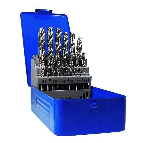 Набір складається з 25 свердлів діаметром: 1мм, 1.5мм, 2 мм, 2.5 мм, 3 мм, 3.5 мм, 4 мм, 4.5 мм, 5 мм , 5.5 мм, 6 мм, 6.5 мм, 7 мм, 7,5 мм, 8 мм, 8.5 мм, 9 мм, 9,5 мм, 10 мм, 10.5 мм, 11 мм, 11.5 мм, 12 мм, 12.5 мм, 13 мм.