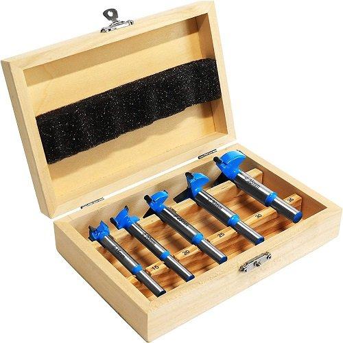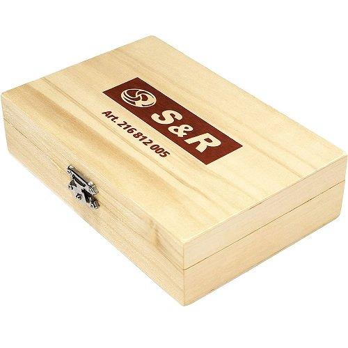 Набір свердел Форстнера по дереву S&R 5 шт. (15, 20, 25, 30, 35 мм) у дерев'яній коробці призначений для роботи разом з електроінструментом. Свердла з комплекту використовуються для свердління дерева, гіпсокартону. Вони виготовлені з кованої інструментальної сталі з твердосплавними карбідовими напайками для збереження протягом тривалого часу своїх ріжучих властивостей. Набір складається зі зручного дерев'яного футляра та 5 свердл наступних розмірів: