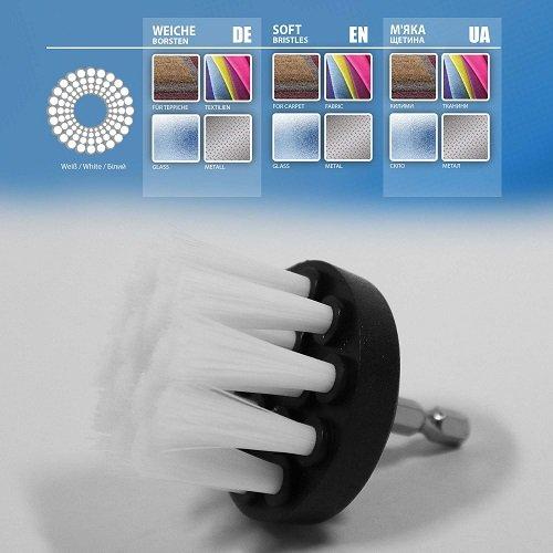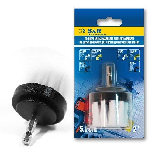 Щітка нейлонова біла S&R 51 мм пряма м'яка — інструмент для роботи з дрилем або шуруповертом. Призначений для чищення меблевої оббивки з тканини або шкіри, килимових покриттів, очищення салону автомобіля, коліс, стекол тощо.