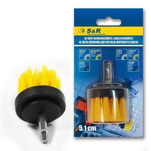 Щітка нейлонова жовта S&R 51 мм пряма середньої жорсткості — інструмент для роботи з дрилем або шуруповертом. Призначений для чищення керамічних, фарфорових, емальованих поверхонь.