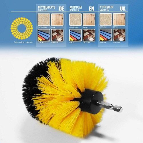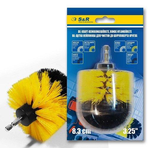 Щітка нейлонова жовта S&R 83 мм кругла середньої жорсткості — інструмент для роботи з дрилем або шуруповертом. Призначений для чищення керамічних, фарфорових, емальованих поверхонь.