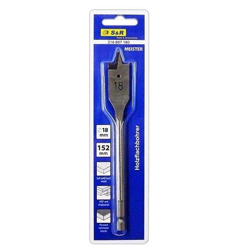 S&R 18x152 мм – пуховий свердло для свердління отворів у м'якій та твердій деревині, в гіпсокартоні, в ДСП та фанері.Свердло пуховий S&R призначений для роботи з дрилем та свердлильними установками. із високовуглецевої сталі, яка забезпечує високий ресурс свердлу для довгих годин роботи. Свердло обладнане хвостовиком HEX діаметром 7,5 мм. Плоска основа з центрувальним вістрям забезпечує якісне свердління отвору діаметром 18 мм.