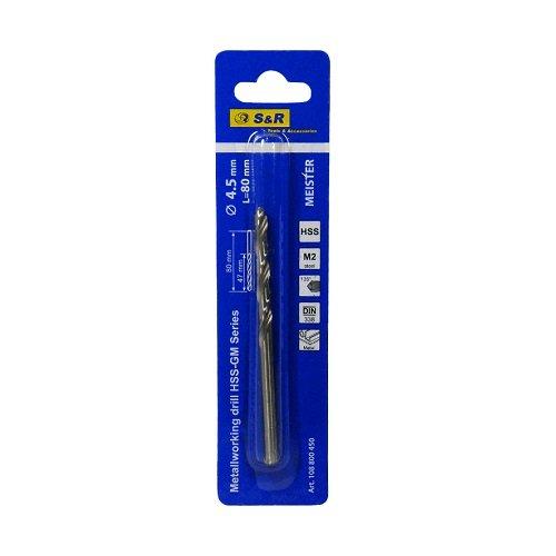 S&R Meister HSS 4.5x80 мм – свердло по металу для свердління отворів у металевих, залізних, пластикових, чавунних поверхнях, а також виробів з кольорового металу. Використовуються свердла з дрилями та свердлильними установками.
