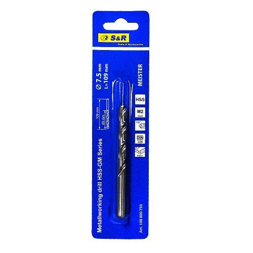 S& Meister HSS 7.5x109 мм – свердло по металу для свердління отворів у металевих, залізних, пластикових, чавунних поверхнях, а також виробів з кольорового металу. Використовуються свердла з дрилями та свердлильними установками.
