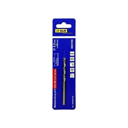 Свердло по металу S&R Meister KM виготовлено із міцної сталі М35, до складу якого входить 5% кобальту, що забезпечує свердлу міцність та стійкість. Кут центру свердла заточений під 135°, що дозволяє працювати з міцними, твердими матеріалами. Свердло по металу S&R Meister KM 3.2х65 мм виготовлене за стандартами DIN338. Обладнано циліндричним хвостовиком. Постачається у блістері.