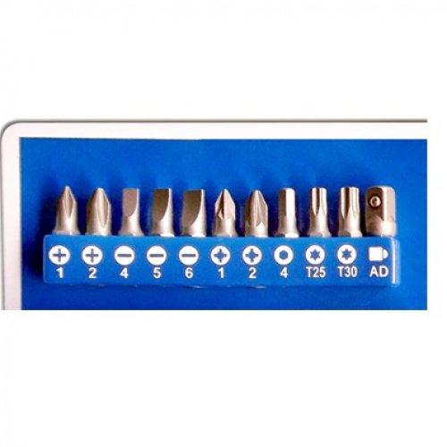 Комплект насадок : РН1; РН2; PZ1; PZ2; SL4мм; SL5мм; SL6мм; HX4мм; TX30мм, адаптер 1/4'.