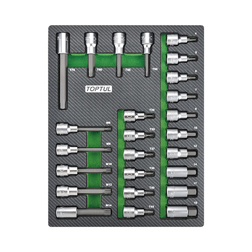 Всі набори інструментів TOPTUL високої якості в даний час розроблені з 2 взаємозамінними розмірами вкладишів (A і B), що дозволяє користувачам легко комбінувати і поєднувати найбільш підходящий і необхідний інструмент у кожному ящику.