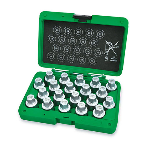 Набір з 20 предметів TOPTUL JGAI2001 підходить для невеликих, середніх і великих секретних болтів і замків. Глибока зворотна конічна внутрішнє різьблення для надійного захоплення блокуючої колесо гайки. Набір застосовується при передпродажній підготовці автомобіля: дозволяє видаляти заводські замки гайок коліс без заводського оригінального ключа.