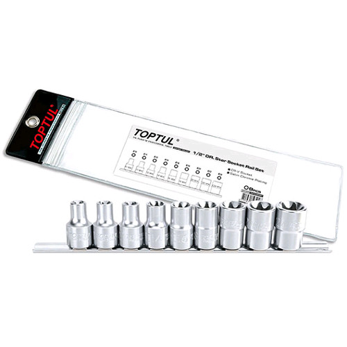 Набір головок TORX на планці TOPTUL 1/2" E10-E24 9ед. GAAG0901 (зірка Давида) під квадрат 1/2 дюйма. Набір складається з 9-ти одиниць. Розміри: E10, E11, E12, E14, E16, E18, E20, E22, E24.
