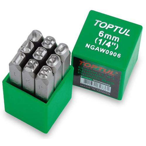 Набір клейм цифрових ударних TOPTUL 9ед. 4мм NGAW0904, виготовлений з хром-ванадієвої сталі. Набір з 9 клем з номерами від 0 до 9 (перевернувши номер 6 отримаємо 9). Упакований в міцний пластиковий корпус.