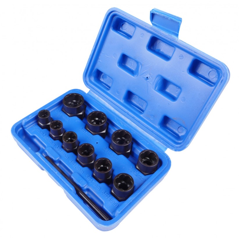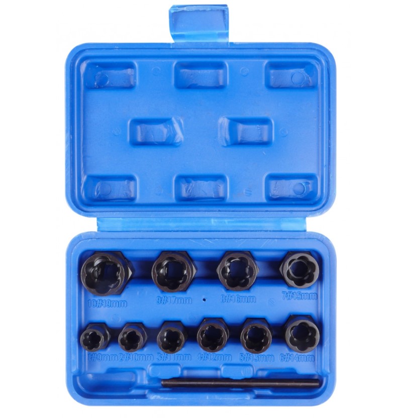 Призначений для демонтажу пошкоджених болтів та гайок. Виготовлений із термообробленої хромомолібденової (Cr-MO) сталі. Зворотні канавки призначені для максимального захоплення. Посадковий квадрат: 3/8Комплектація: Головка спеціальна: 9, 10, 11, 12, 13, 14, 15, 16, 17, 19ммШтифт довжина 90мм, діаметр 6мм.