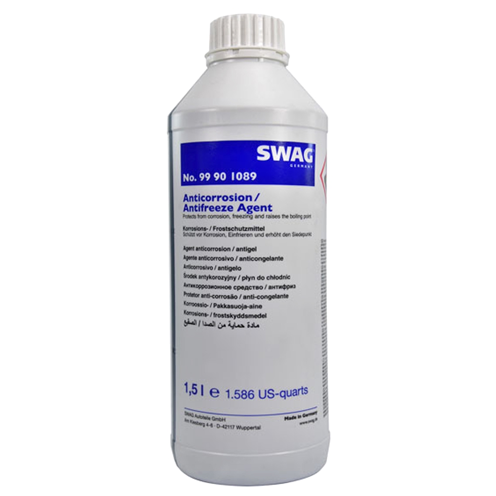 SWAG № 99 90 1089 являє собою засіб для захисту від замерзання та корозії для всіх типів двигунів внутрішнього згоряння з рідинним охолодженням. Вже при вмісті від 25% SWAG № 99 90 1089 захищає від корозії ікавітації, накипу, осаду та спінювання. У будь-якому випадку слід дотримуватись рекомендацій виробника транспортного засобу. Успішно використовується в двигунах з алюмінієвими головками блоку циліндрів та радіаторами. SWAG № 99 90 1089 перевірений на практиці та випробуваний на агрегатах з інструкціями із заливання відповідно до норм MAN 324, MB 325.0 та GM 1825M.