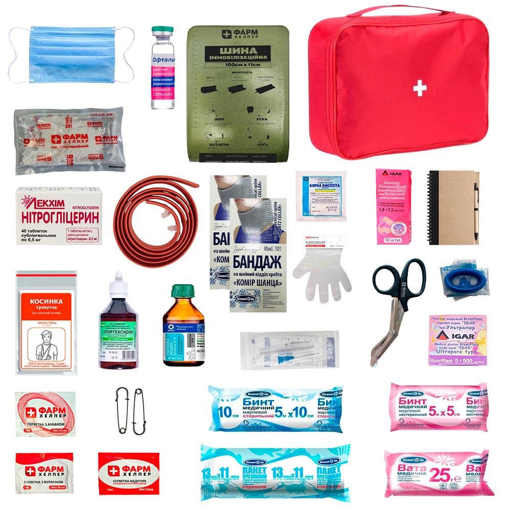 Аптечка відповідає вимогам стандартів цивільного та військового медичного забезпечення, містить засоби для надання допомоги при травмах, кровотечах, опіках, отруєннях, пораненнях, ураженнях вибуховою хвилею чи димом.