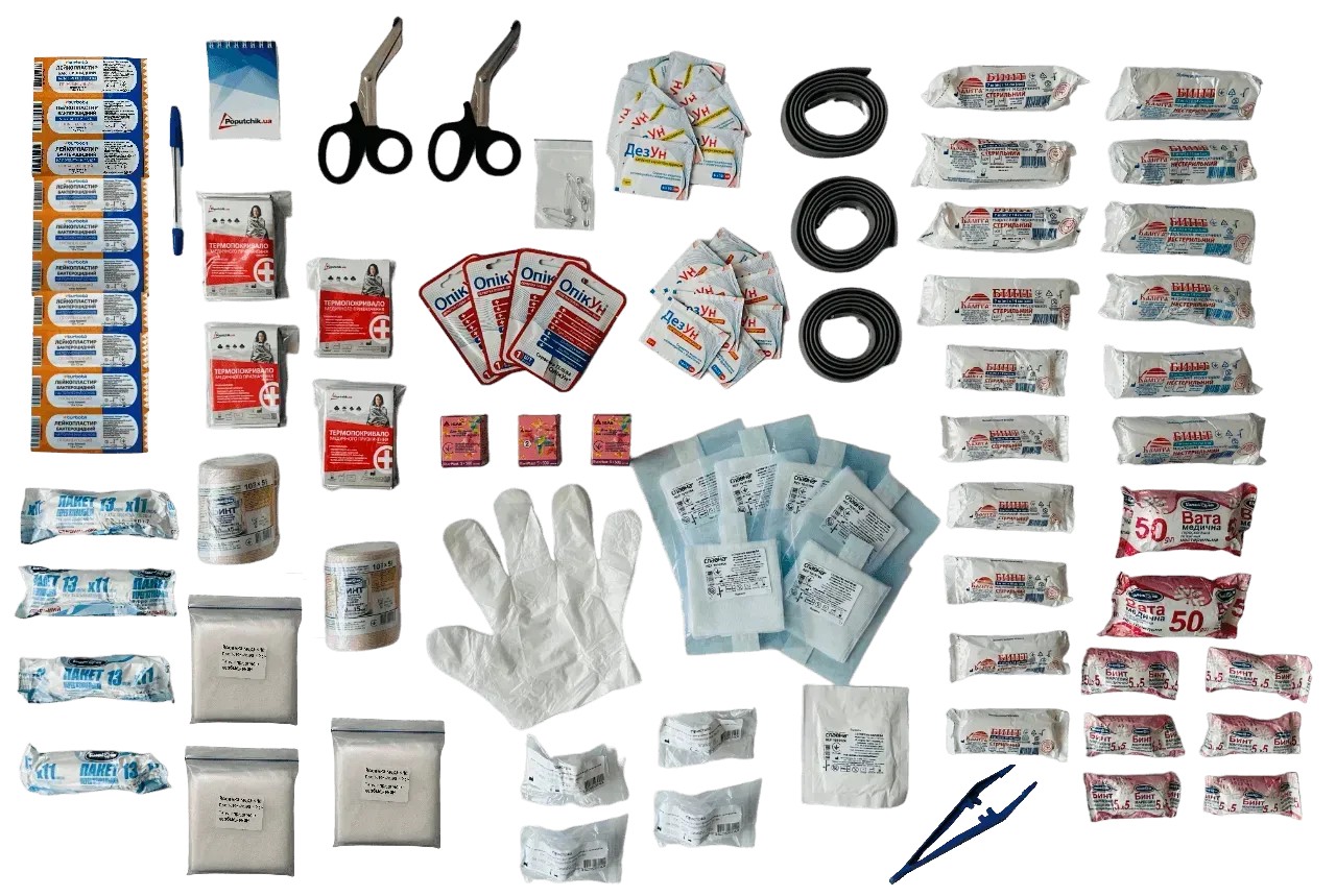 Аптечка містить набір виробів медичного призначення, оснащений антисептичними, дезінфікуючими, протиопіковими, реанімаційними, фіксуючими та іншими допоміжними засобами для своєчасного надання першої допомоги постраждалому при травмах, переломах, вивихах, втраті свідомості