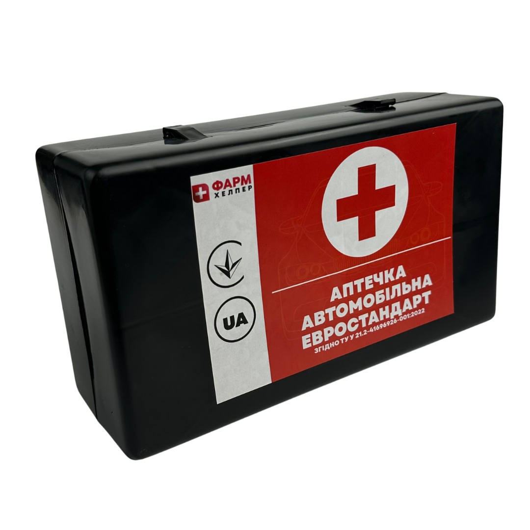 Всі елементи аптечки відповідають вимогам Європейського стандарту безпеки (Євростандарт), а надійний жорсткий футляр забезпечує захист вмісту від вологи, пилу, механічних пошкоджень та сонячних променів.