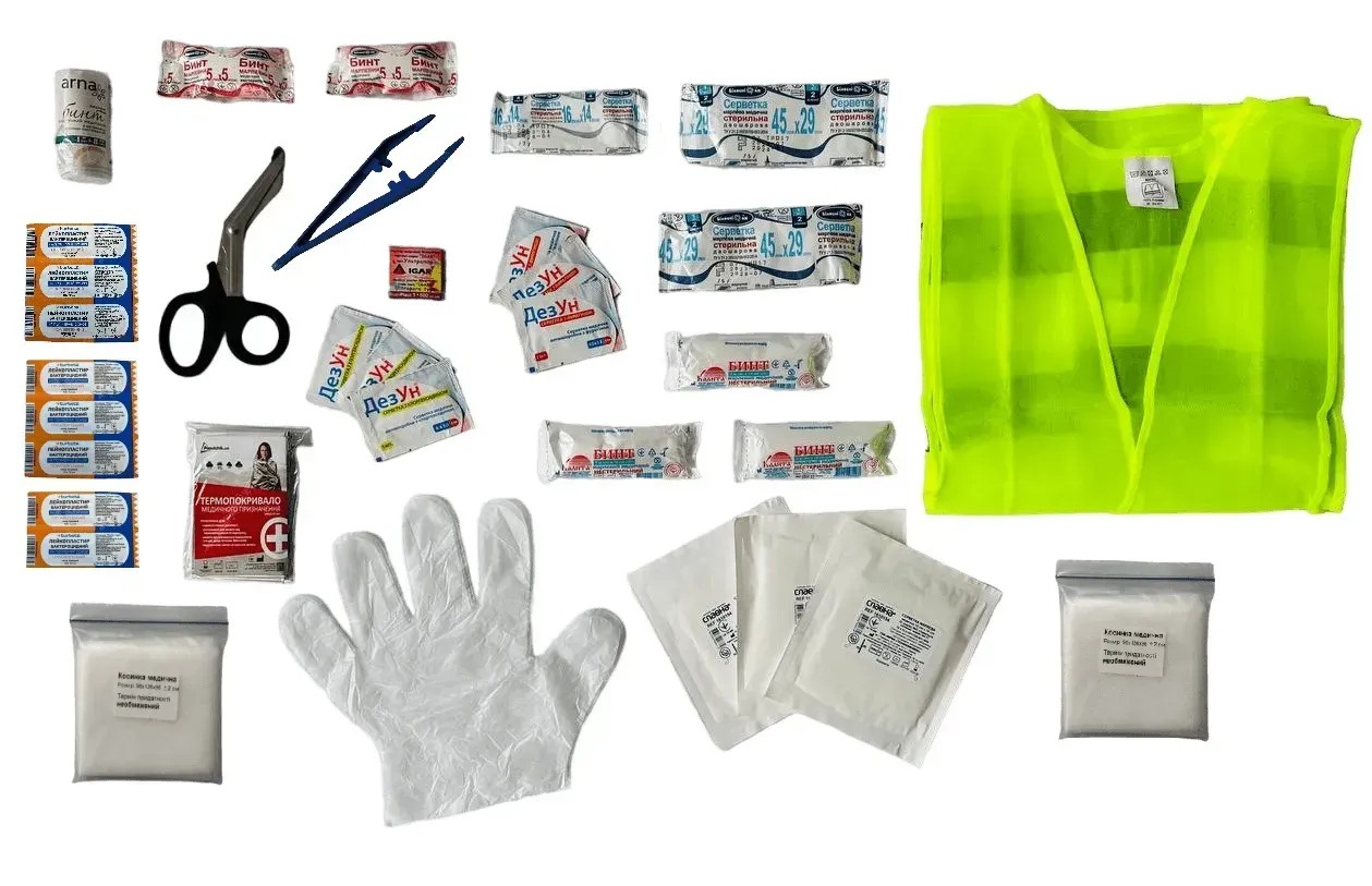 Аптечка містить вироби для обробки та перев'язки ран, антисептичні, дезінфекційні, протиопікові та інші додаткові засоби, довідник з надання першої допомоги та рекомендації щодо застосування вкладень.