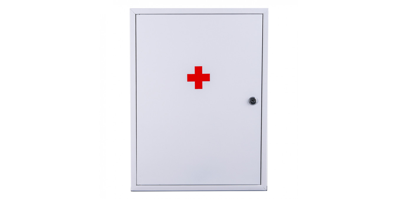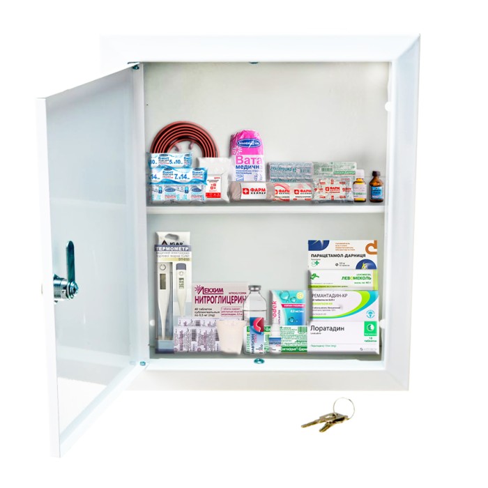 Аптечка розміщується у зручному настінному футлярі — пластиковому або металевому — що гарантує доступність і впорядкованість усіх медичних засобів.