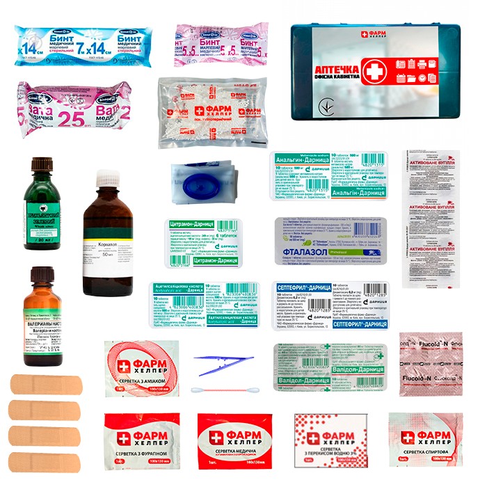 Аптечка офісна кабінетна — це універсальний набір засобів першої допомоги, призначений для використання у службових та адміністративних приміщеннях. Вона забезпечує можливість швидкого реагування на нещасні випадки, раптове погіршення самопочуття або травми працівників до прибуття медичної допомоги.