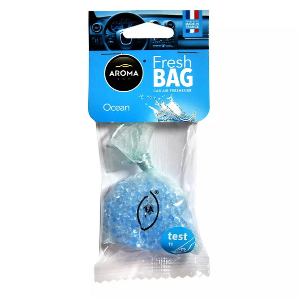 830306 Ароматизатор Aroma Car Fresh Bag Океан 20g. Сучасний полімерний ароматизатор повітря Aroma Car із серії Fresh Bag є сітчастим мішечком наповненим полімерними гранулами і призначений для підвішування на дзеркало заднього виду. Гранули ароматизатора насичені ароматами на основі французьких парфумів. Ароматизатор має аромат Ocean (Океан). Технологія: У виробництві використовується сучасний безпечний полімерний матеріал у вигляді гранул, який насичений концентратом парфумерної композиції. Аромат виділяється в процесі випаровування аромату з нанопор полімерного матеріалу. ІНСТРУКЦІЯ ЗАСТОСУВАННЯ: Дістаньте з упаковки мішечок ароматизатора. За допомогою тасьми, закріпленої на мішечку, повісьте на внутрішнє дзеркало заднього огляду автомобіля.