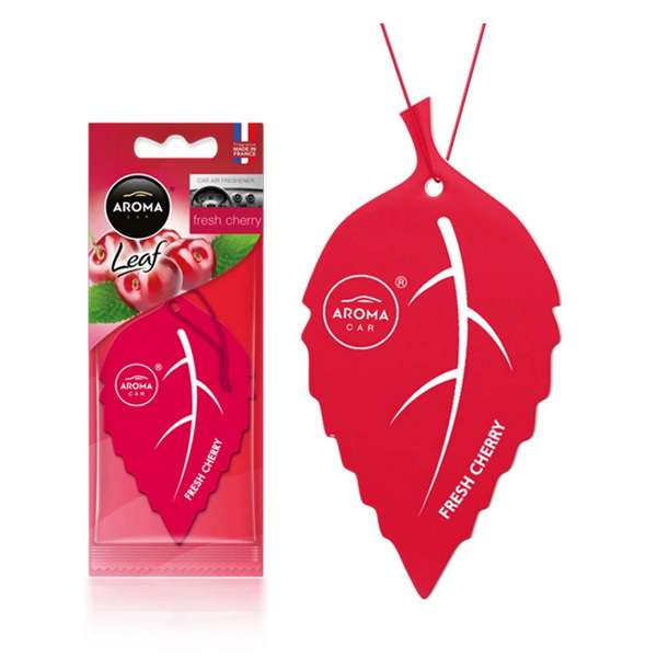 922158 Ароматизатор Aroma Car Leaf Fresh Cherry. Автомобільний ароматизатор Aroma Car із серії Leaf - з ароматом Cherry (922158) - целюлозний освіжувач повітря у вигляді листка дерева, просоченого рідкою парфумерною композицією. Цей недорогий класичний ароматизатор підвішують за допомогою нитки на дзеркало салону заднього виду.