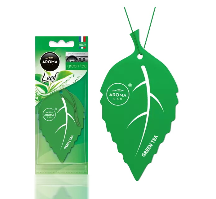 922578 Ароматизатор Aroma Car Leaf Green Tea. Автомобільний ароматизатор Aroma Car із серії Leaf - з ароматом Green Tea (922578) - целюлозний освіжувач повітря у вигляді листка дерева, просоченого рідкою парфумерною композицією. Цей недорогий класичний ароматизатор підвішують за допомогою нитки на дзеркало салону заднього виду.