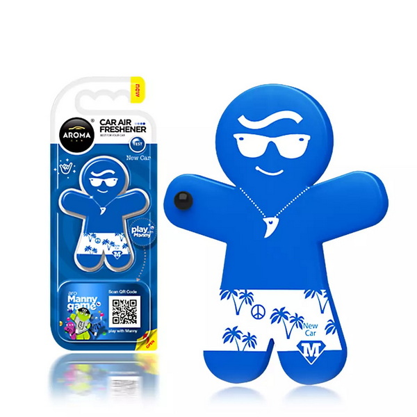 929966 Ароматизатор Aroma Car Manny NEW CAR. Ультрасучасний полімерний ароматизатор повітря Aroma Car із серії Manny, виконаний у формі чоловічка, необхідно використовувати на решітці вентиляції в салоні автомобіля. Ароматизатор можна застосувати як ароматизований брелок для ключів, як прикраса для сумочки, рюкзака або як оригінальний ароматизатор для гардероба, для цього в комплекті передбачено пластикове кільце. Ароматизатор має приємний аромат New Car (Нова машина).